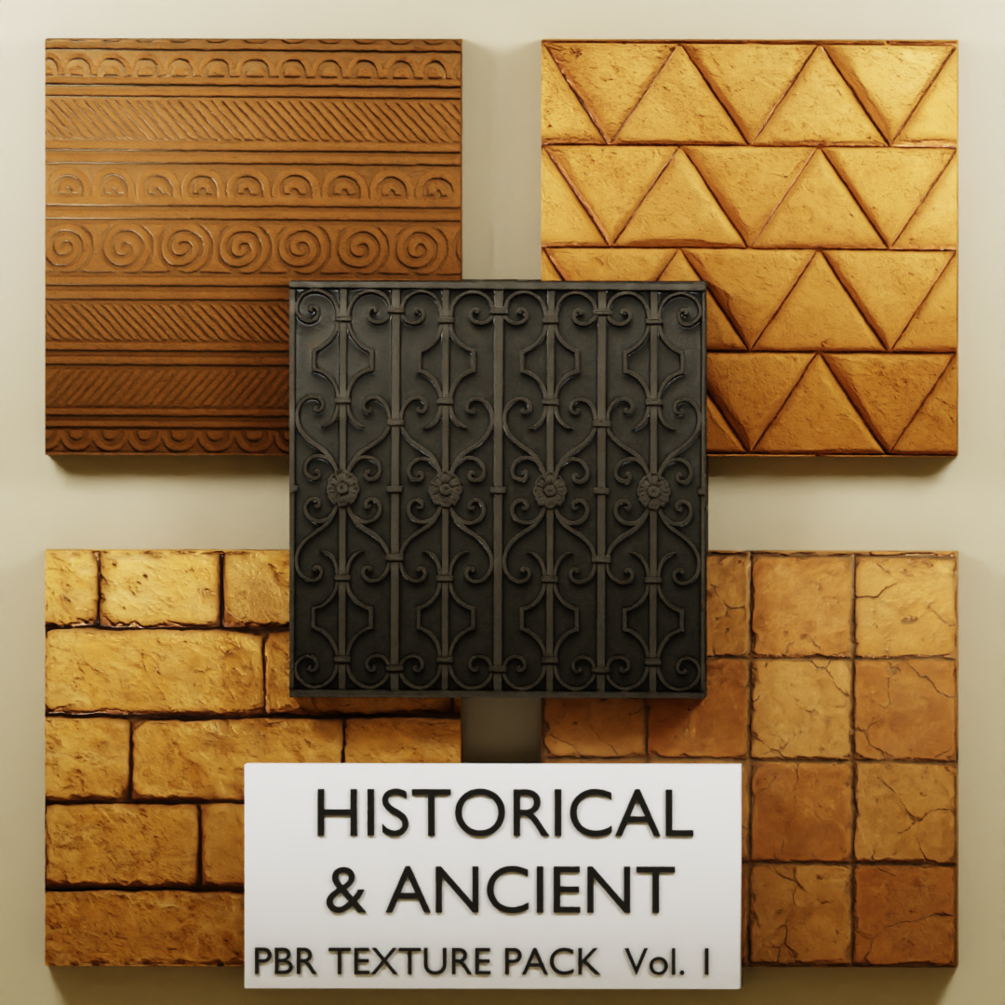 The Historical & Ancient PBR Texture Pack includes 25 high-quality materials designed for use in games, films, architectural visuals, and 3D projects of all kinds.