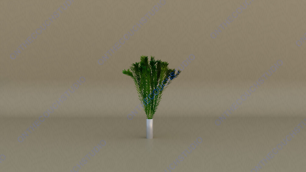 3D model of a potted plant with a sleek and modern design. The plant is placed in a tall, cylindrical white pot, providing a simple and elegant base. The plant itself consists of dense, upward-growing stems, covered with needle-like leaves that create a bushy, vertical appearance. The foliage is a vibrant green, with the dense arrangement giving the plant a lush, healthy look. The arrangement is set against a neutral beige background, which helps to highlight the green hues of the plant. This model would be suitable for interior design visualizations, adding a touch of greenery to any space. It could also be used in tutorials that focus on creating realistic plant textures and modeling techniques. The overall design is versatile and can complement various indoor settings in 3D renderings. All working files, references, animations, textures, FBX, OBJ, STL and .blend file included in zip file. Specific Model statistics in pictures. If you would like something specific or need help with any model please just email onthecouchstudio@onthecouchstudio.com. Thank you.